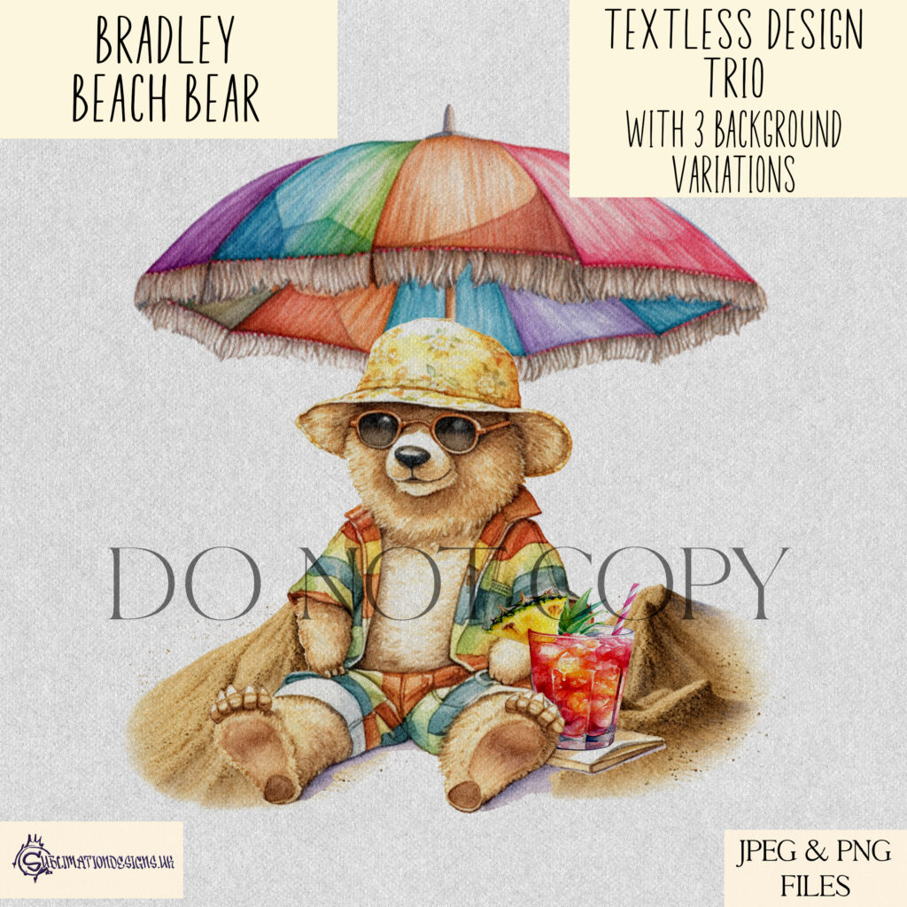 Bradley comes in 3 variations, 2 Beach Setups with Transparent Backgrounds, and a Paint Splash Background. The design is textless, so you can use it for multiple products, and events but is not to be resold digitally, and is for use on your made products only.