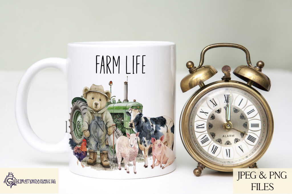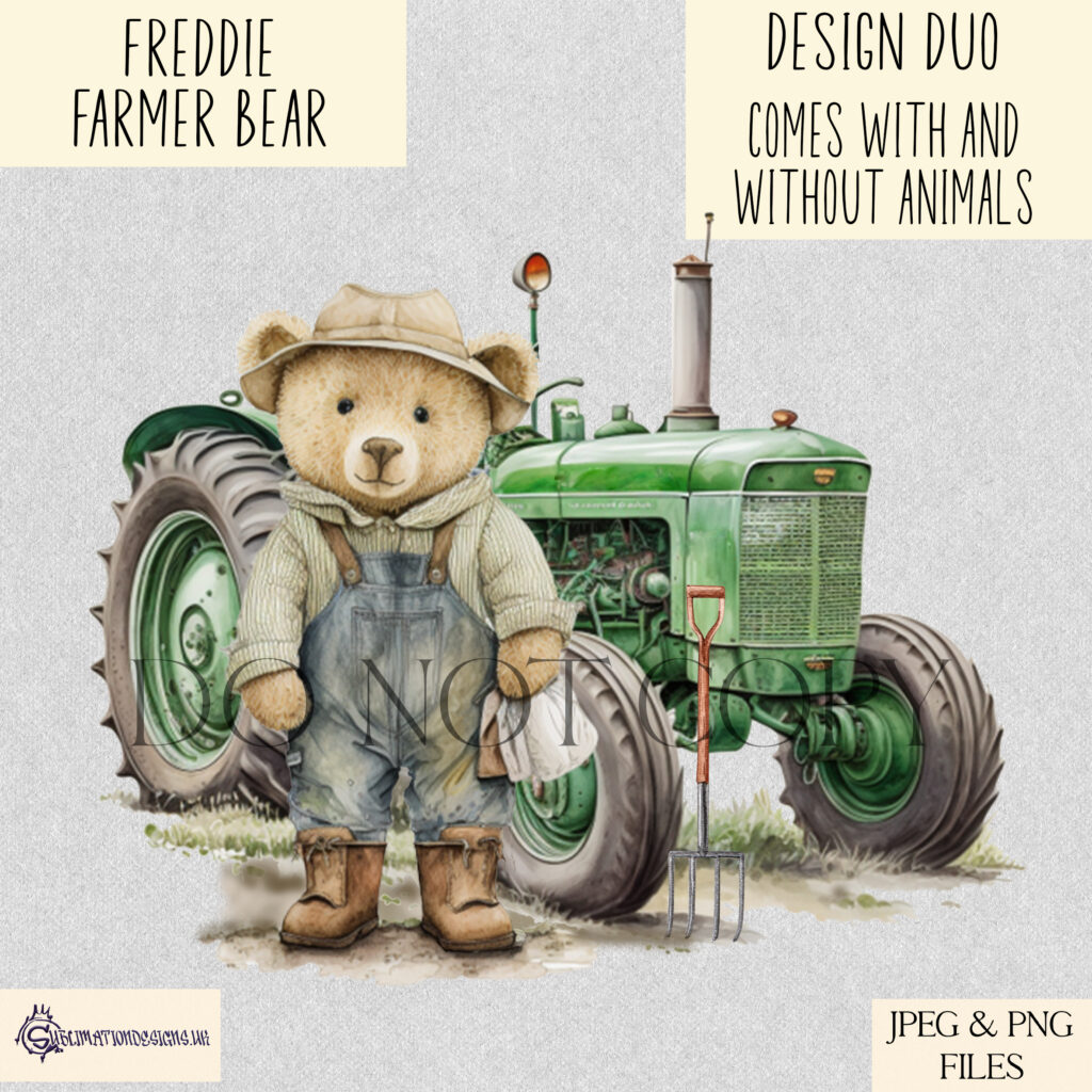 1 Freddie Bear Design with a tractor, and farm animals in JPEG and PNG Files.