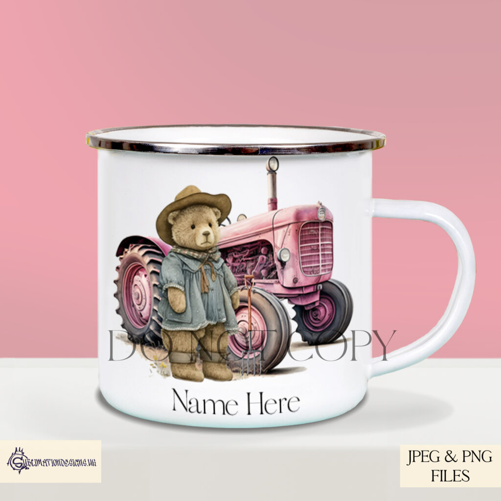 This set features self-created artwork called Freya Bear, Part of the Ever Popular Bear Collection. Here she is with the Pink Tractor.