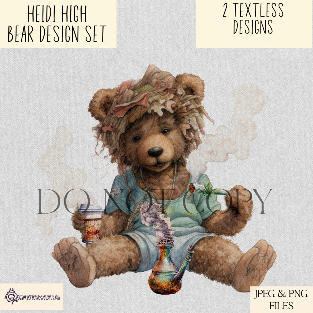 This set features self-created artwork called Heidi Bear, Part of the Ever Popular Bear Collection. Here she is with 3 textless designs. This is a request for the novelty market and is not going to be for everyone’s taste.