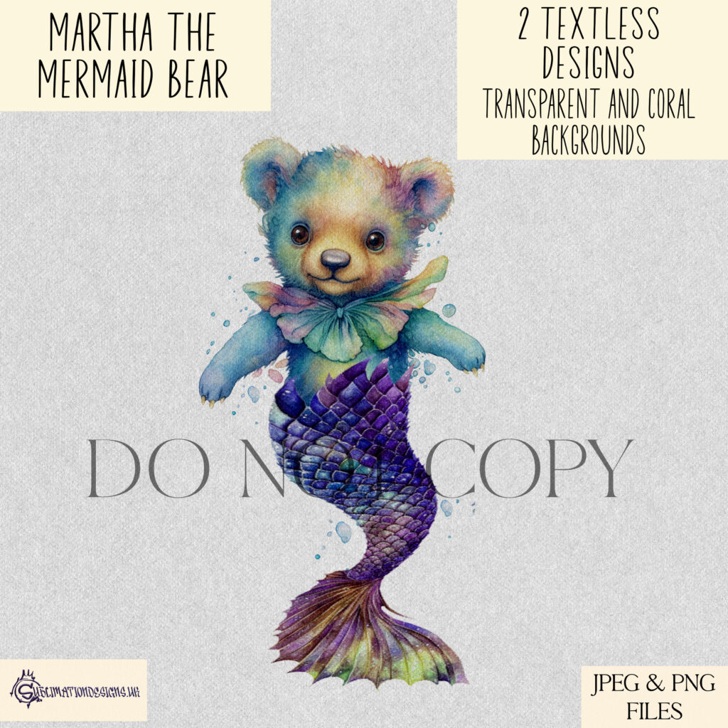 Martha comes in 2 variations, 1 bubble splash background, and one coral reef background. The design is textless, so you can use it for multiple products, and events but is not to be resold digitally, and is for use on your made products only.