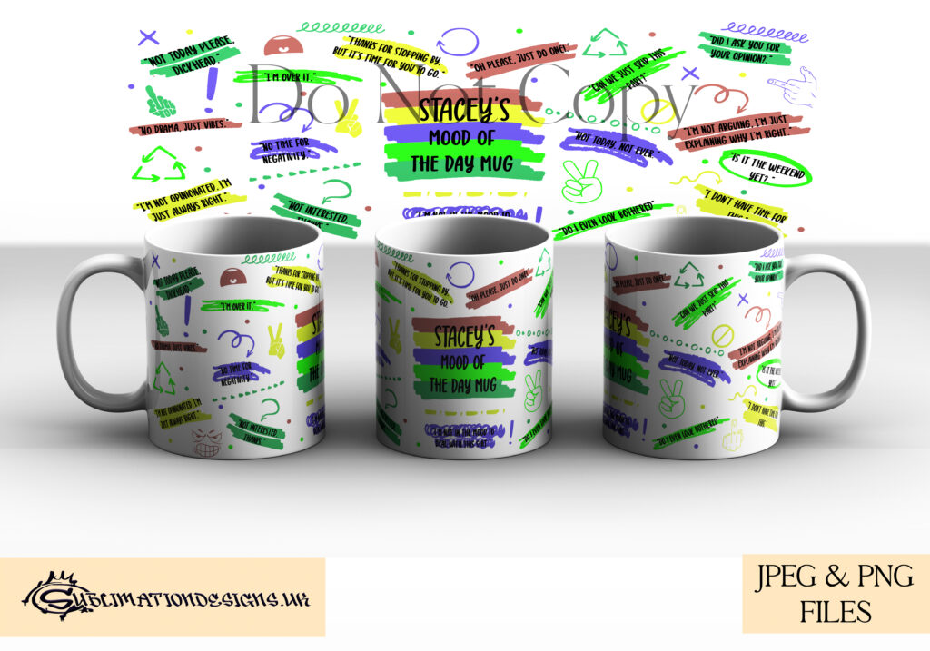 Here you will find a comedy design set of Mugwraps. These Sassy Mood Mug Wraps come in a set of 12. 4 Colourways, 2 phrases, and a blank to personalize.
