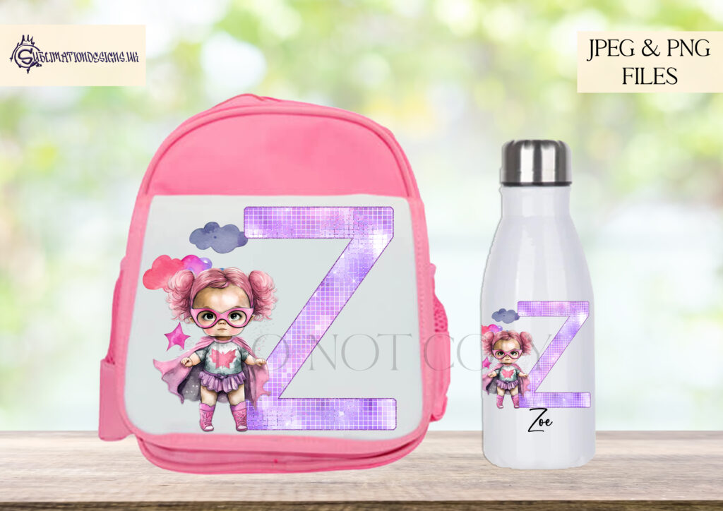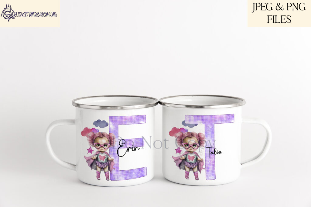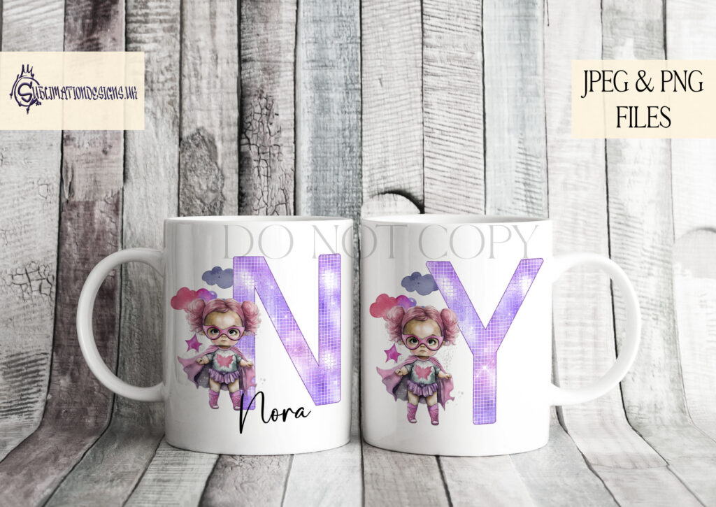 This is a girl’s version of the superhero alphabet series, featuring this little cutie with Purple customer and Glitzy Letters.