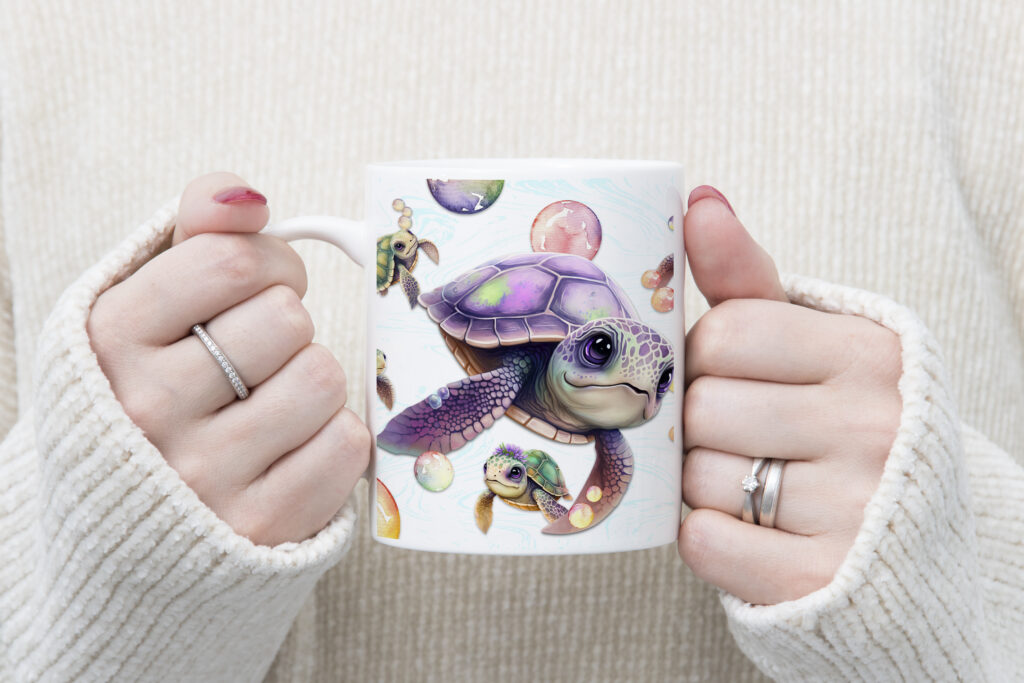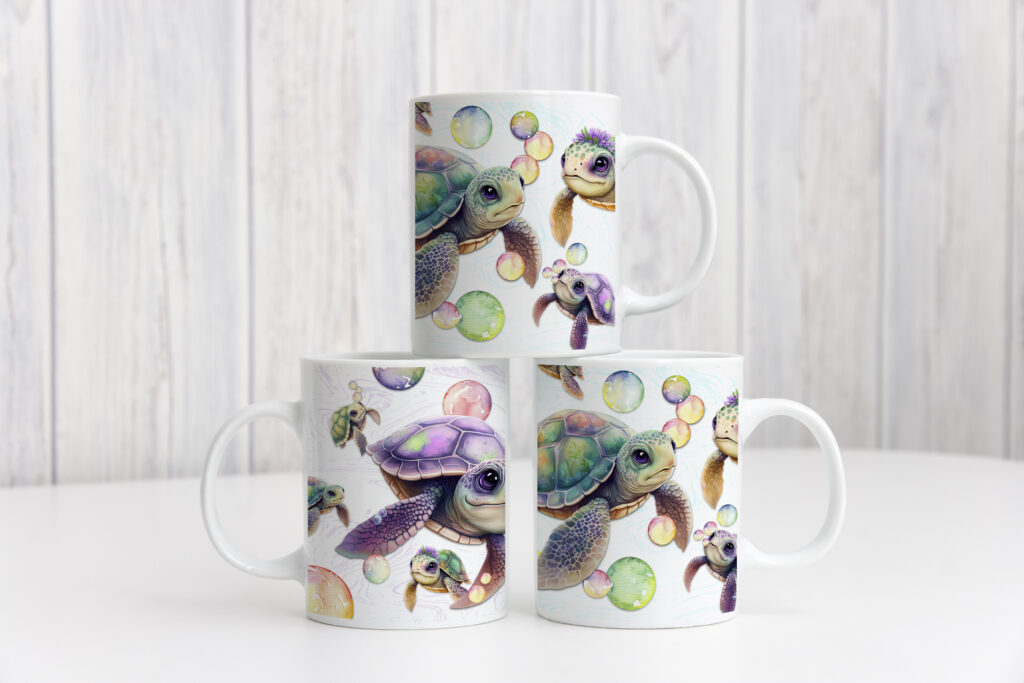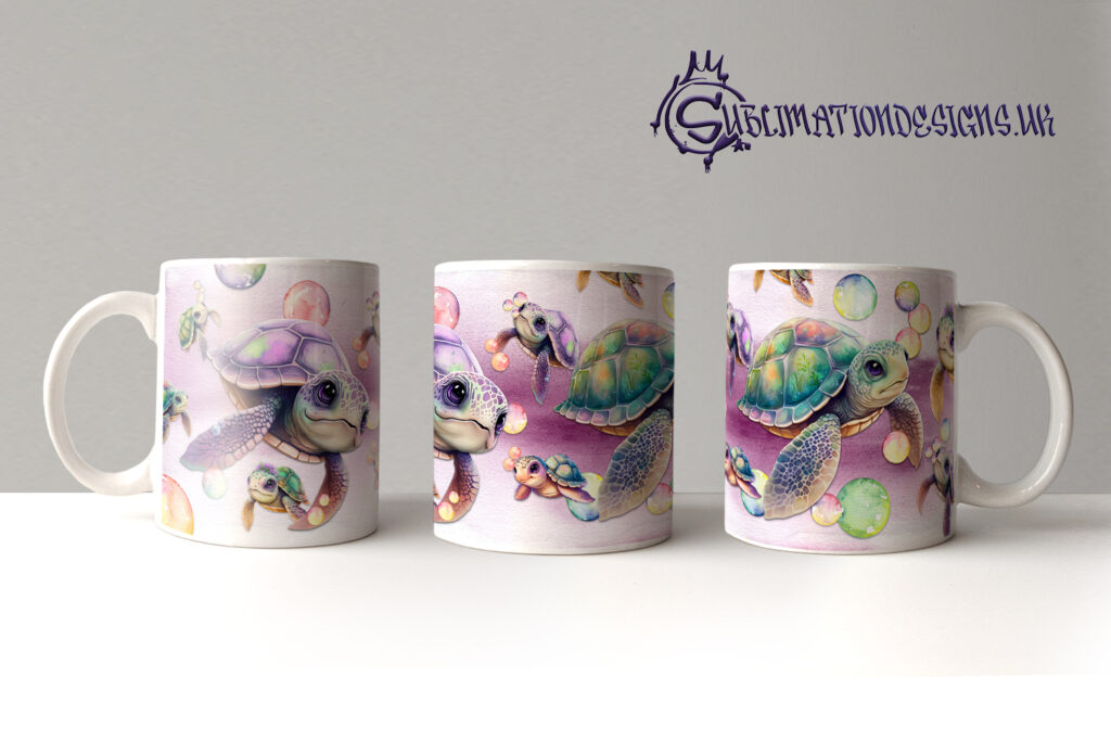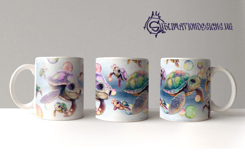 This high-quality design image has been an instant success. These gorgeous sea turtles, in vibrant colours, form a mug wrap design with elegant watercolour backgrounds, and bubbles.