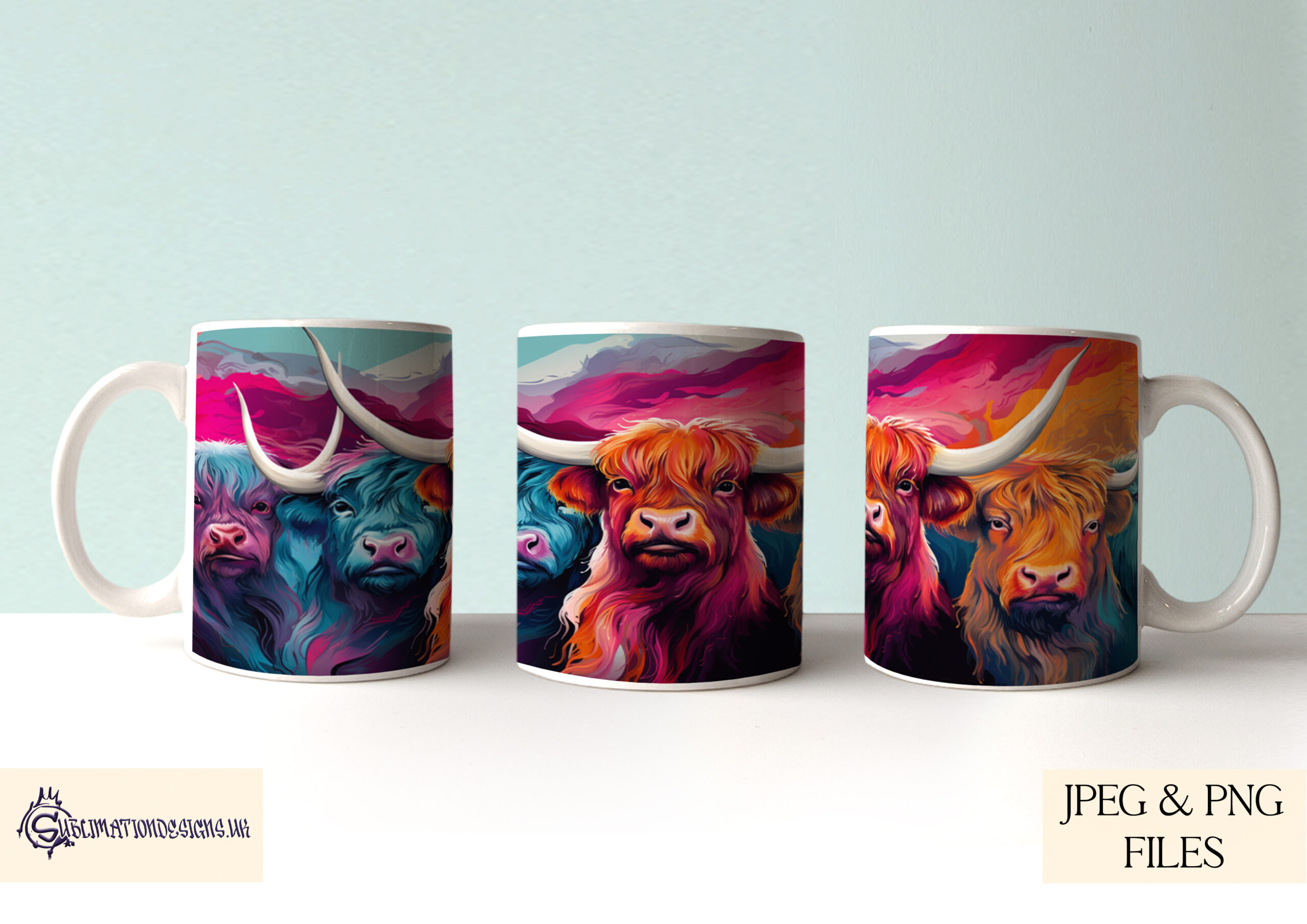 Embrace the calming allure of Highland Cows with our Vibrant and Pastel Mug Wrap. This captivating design showcases the majestic creatures in serene shades of colour, adding a touch of elegance to your daily coffee ritual. Crafted with love, our textless design allows the artwork to speak for itself, making it a perfect gift for cow lovers and nature enthusiasts alike.